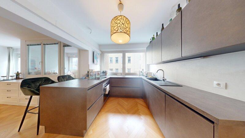 Intelligent gegliederte, separate Wohnbereiche - Hier haben Familien mit Kind großzügigen Raum. Das Zentrum der Wohnung bildet das geräumige Wohnzimmer mit offener Küche und Zugang zur verbauten Loggia. Darum herum gliedern sich separate Wohnbereiche für die Familienmitglieder, Elternschlafzimmer, Home-Office und Kinderzimmer. Zudem verfügt die Wohnung über eine separate Toilette, Bad mit Walk-in Dusche und Doppel-Handwaschbecken, Abstellraum mit Waschmaschinenanschluß sowie Vorraum und Flur.