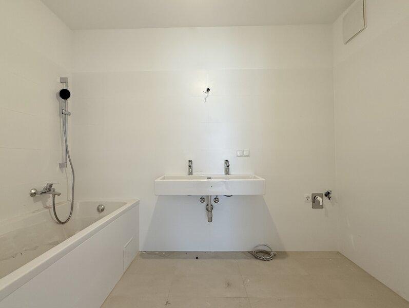 - Badezimmer mit Badewanne, Doppelhandwaschbecken und Waschmaschinenanschluss