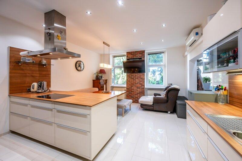 Die Wohnung wurde generalsaniert und sehr hochwertig und geschmackvoll ausgestattet. Durch die Schaffung eines großzügigen Wohn-/Essbereiches mit integrierter Küche stehen zwei geräumige Schlafzimmer zur Verfügung. Die Wohnung ist sehr hell und bietet eine angenehme und freundliche Atmosphäre.