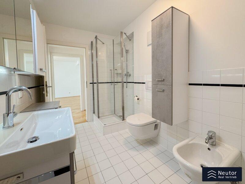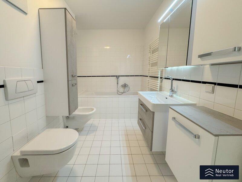 Mit Badewanne und separater Dusche präsentiert sich das ebenfalls über den Gang begehbare Badezimmer als stilvoller Rückzugsort, der Funktionalität und Wohlgefühl harmonisch vereint. Ein WC und ein Bidet fügen sich elegant ins Gesamtbild ein.