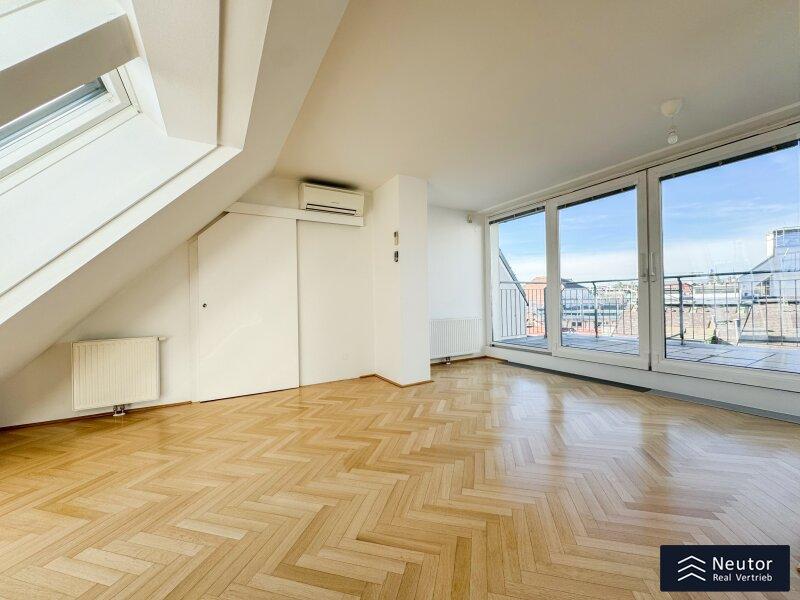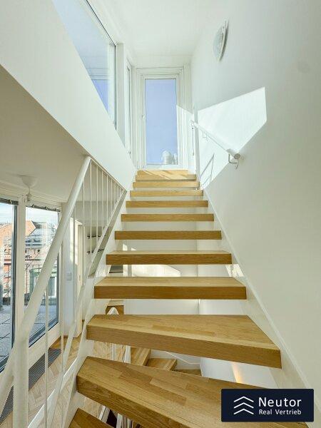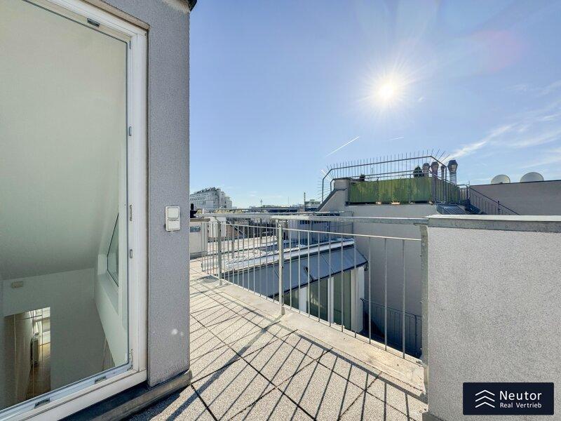 Ein absolutes Highlight ist die private Dachterrasse, die über eine weitere Treppe erreichbar ist. Von hier aus eröffnet sich ein atemberaubender Panoramablick über die Dächer der Wiener Innenstadt bis hin zum majestätischen Stephansdom. Ein Ort, der zum Entspannen einlädt und das pulsierende Stadtleben aus einer ganz besonderen Perspektive genießen lässt.