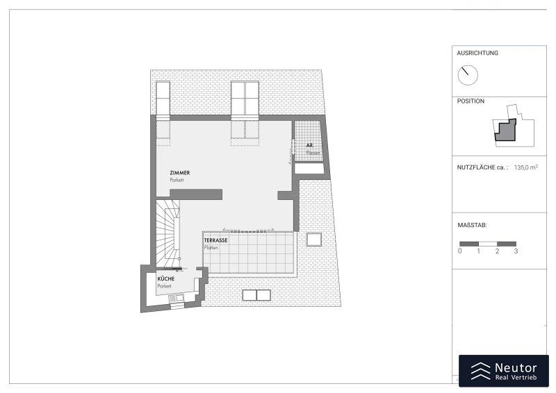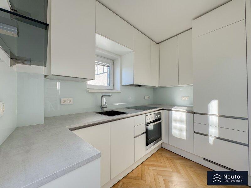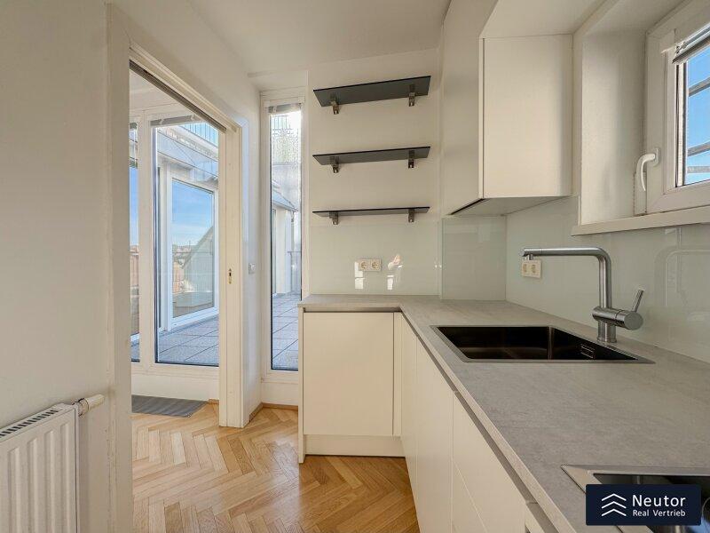 Über eine Treppe gelangt man in den hellen, offenen Wohnbereich, der durch seine freundliche Atmosphäre und den direkten Zugang zur Terrasse besticht. Die großzügige Terrasse bietet einen traumhaften Blick über die Wiener Innenstadt und lädt zu entspannten Stunden im Freien ein. Auf dieser Ebene verbinden sich Stil und Behaglichkeit zu einem Ort, an dem man sich gerne aufhält. Die separate Küche mit Fenster ist nicht nur funktional, sondern auch charmant gestaltet und bietet einen angenehmen Platz zum Kochen und Genießen.