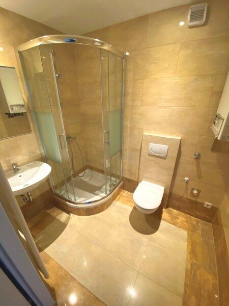 Im Badezimmer ist die Ausstattung/Materialien von namhaften Firmen wie Villeroy, Grohe und Laufen.