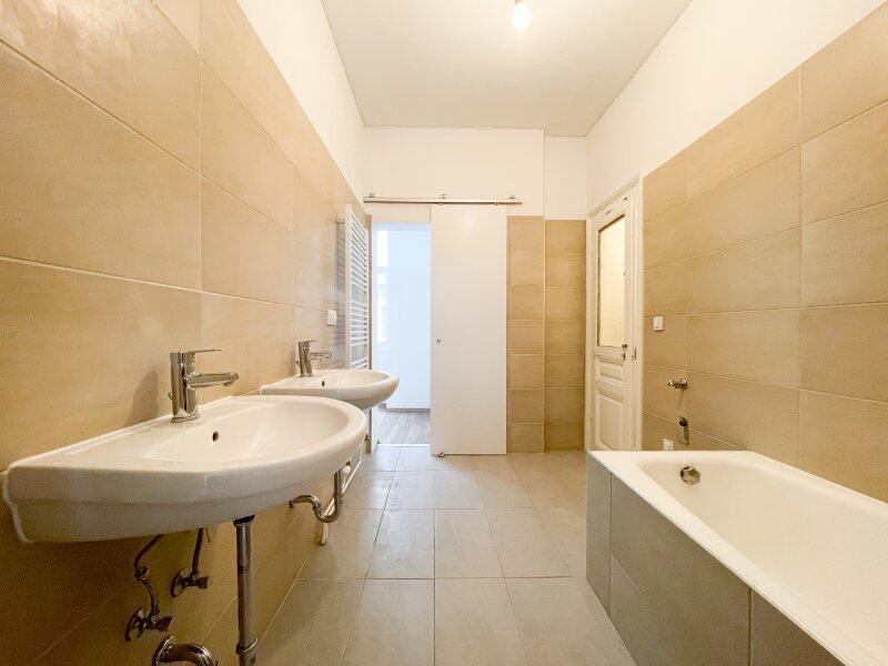 • Modernisiertes Badezimmer mit Badewanne, Doppelwaschbecken und Waschmaschinenanschluss