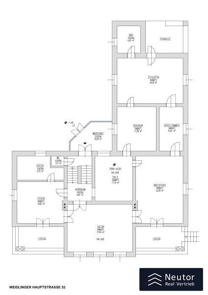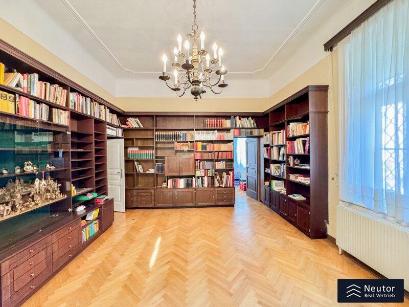 Edler Echtholzparkett zieht sich durch die gesamte Belle Etage. Hohe Doppelflügeltüren eröffnen spannende Blickachsen und verleihen den Räumen ein herrschaftliches Flair. Das Herzstück bildet der zentral gelegene Wohnsalon mit angrenzendem Speisezimmer und Bibliothek, von denen die beiden bezaubernden Loggien den Blick ins Grüne freigeben.