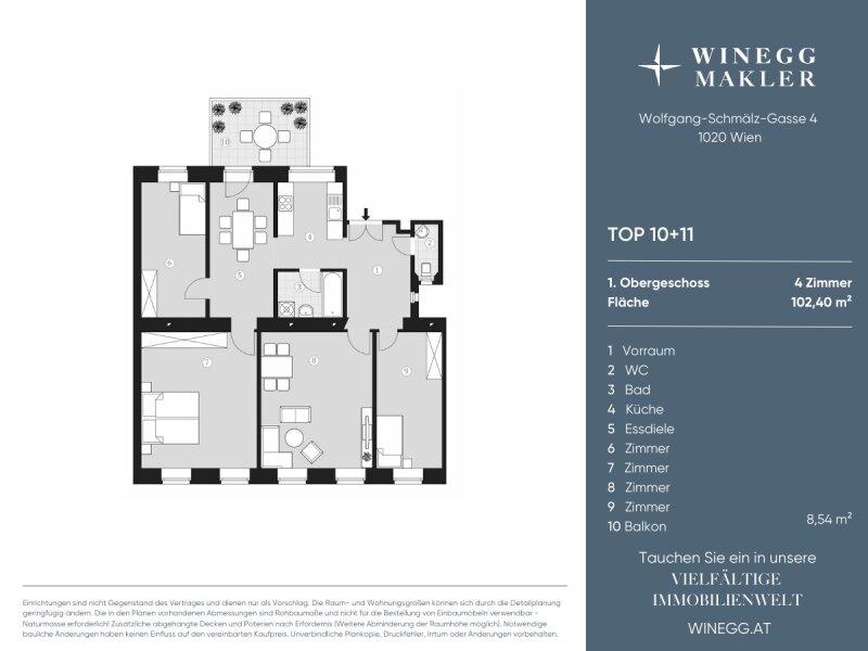 Zum Verkauf gelangt eine 4-Zimmer-Wohnung in Top-Lage des 2. Bezirks. Sie verfügt über ca. 102 m² Wohnfläche und teilt sich wie folgt auf: