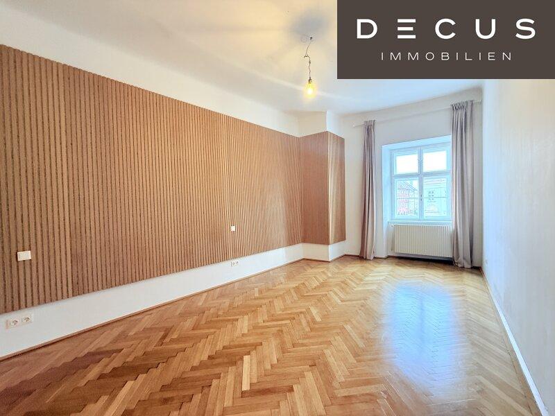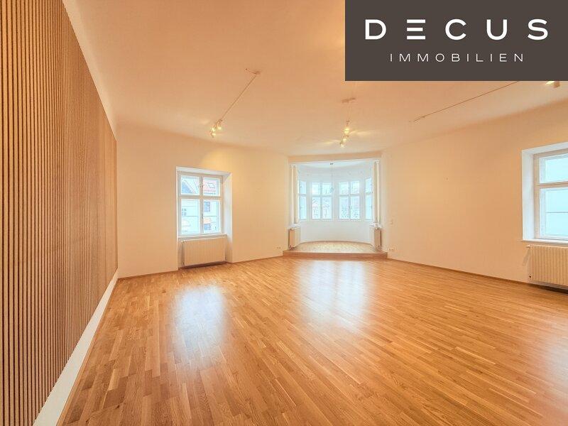 Die Wohnung ist von einem Vorraum aus zentral begehbar. Aus dem großzügigen Wohn-Esszimmer mit 48 m² hat man einen direkten Blick auf den Wiener Neustädter Hauptplatz. Dieser helle Raum besticht durch einen charmanten Erker. Die Räume sind mit modernen Akustikpaneelen und Parkettböden ausgestattet, was eine luxuriöse Stimmung schafft. Die moderne Küche ist mit hochwertigen Siemens-Geräten ausgestattet. Die Terrasse ist westseitig ausgerichtet und bietet Privatsphäre.