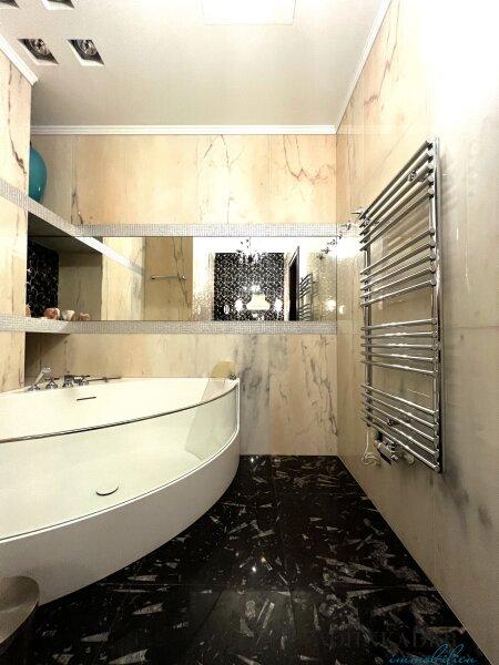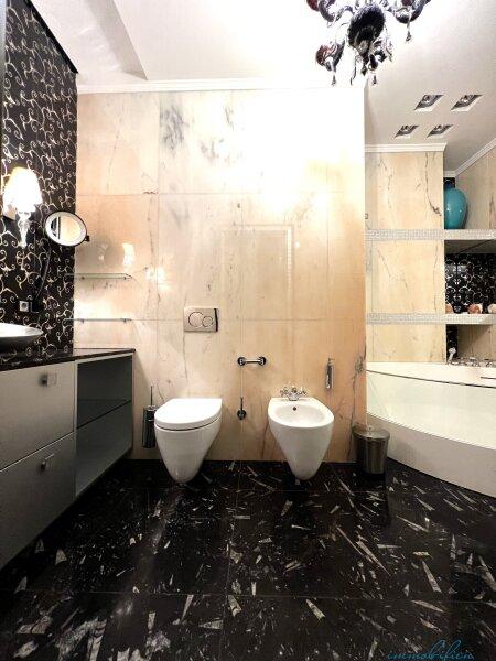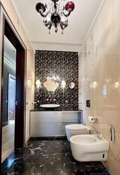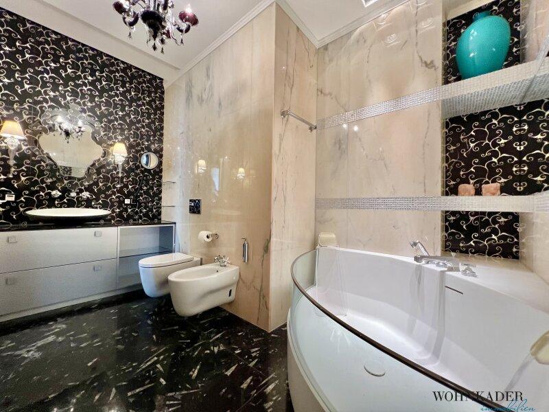 Das Vorzimmer verfügt über eine geräumige begehbare Garderobe, und eines der Badezimmer ist stilvoll mit Dusche, WC und Handwaschbecken ausgestattet. Das zweite Badezimmer bietet ein Whirlpool-Bad, einen eleganten Waschtisch mit einem Murano-Spiegel und einen atemberaubenden Kronleuchter aus Original Murano-Glas, der in der Mitte des Badezimmers von der Decke hängt.