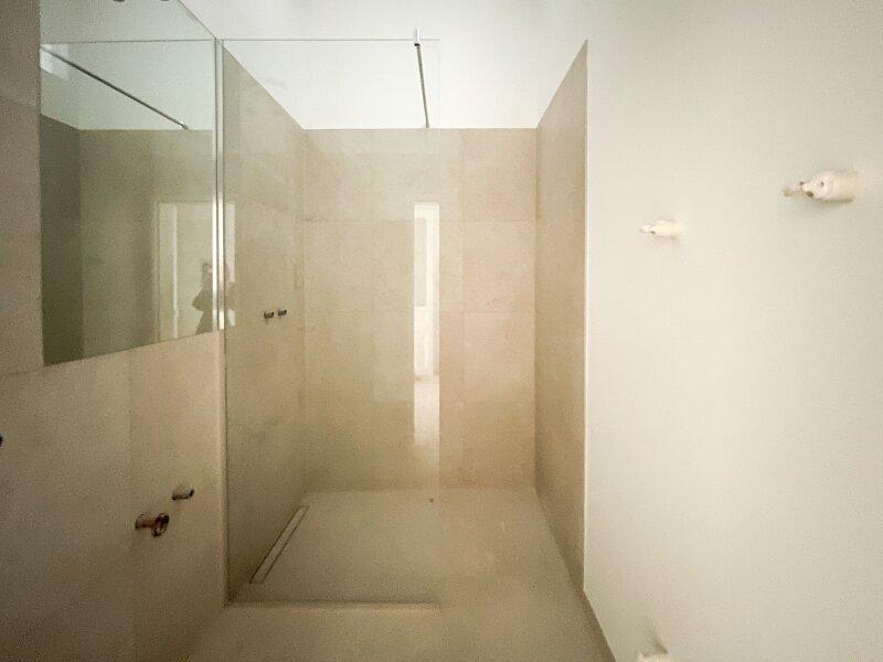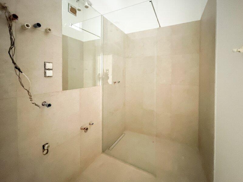 Badezimmer mit Dusche und Oberlichte (= Tageslicht) in Richtung Küche