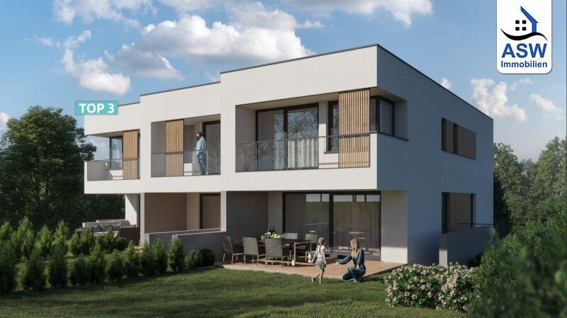 Jedes Haus verfügt über eine Garage, einen Stellplatz im Freien und einen kleinen Vorgarten. TOP 1 und  TOP 3 verfügen zusätzlich über eine zweite Terrasse, die über das Esszimmer zugänglich ist.