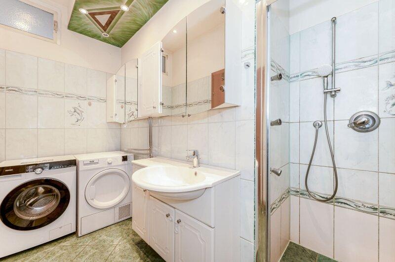 - Badezimmer mit Dusche, Waschmaschinenanschluss und Waschbecken