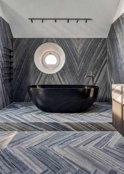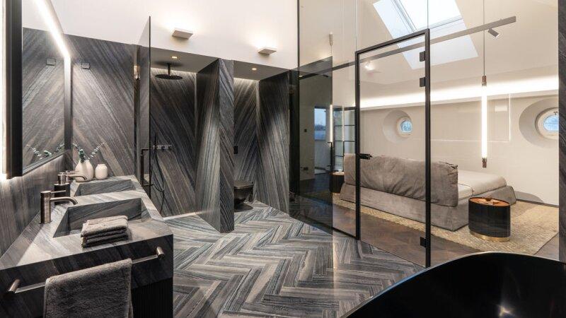 - Exklusives Badezimmer: Ausgestattet mit Marmor von Antolini aus Italien, Dusche, WC, freistehender Badewanne und Sanitärgegenständen von Gessi, sowie einem Handtuchheizkörper von Vola lässt dieses Bad keine Wünsche offen.