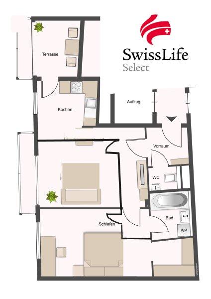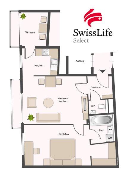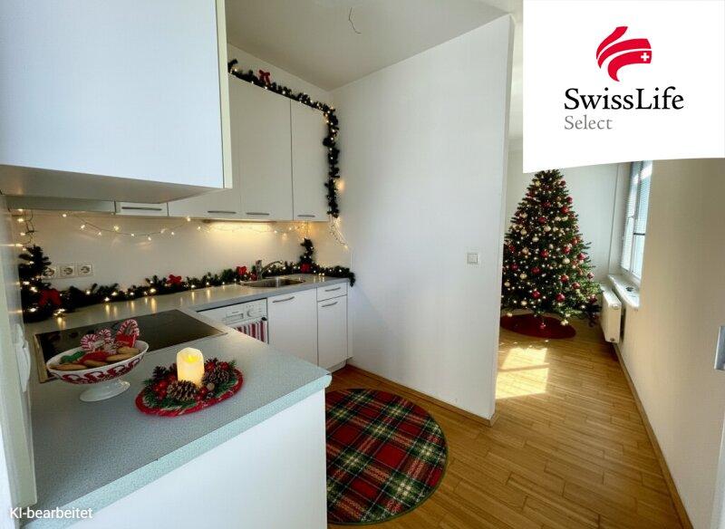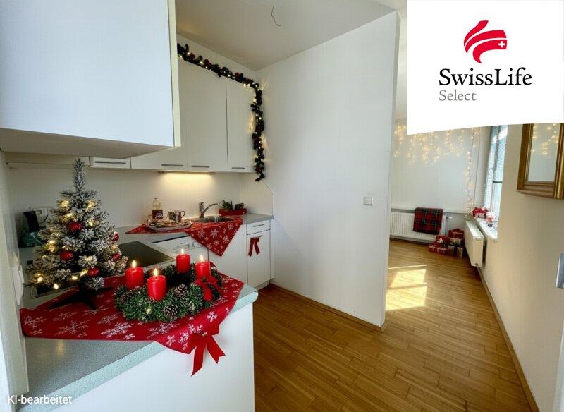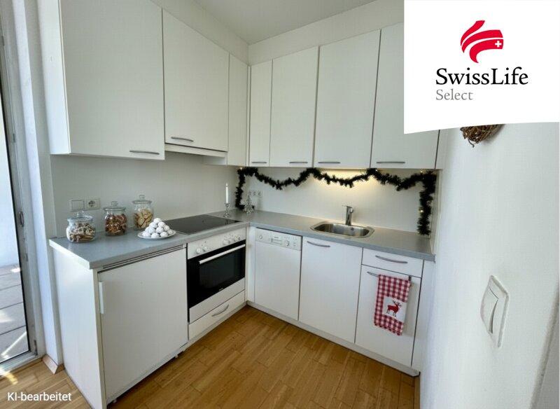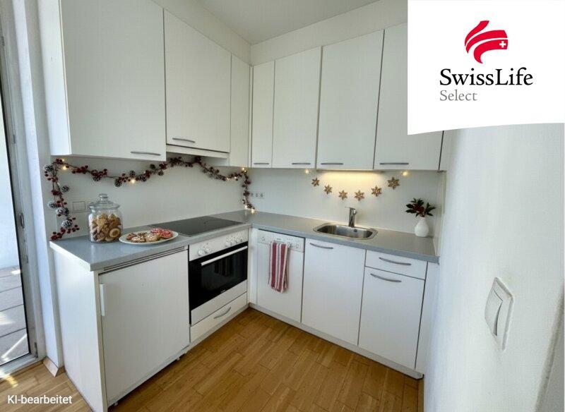 Eine bereits vollständig ausgestattete L-förmige Einbauküche dient als gemeinsamer Treffpunkt für die WG. Von hier aus gelangt man auf die westseitige, überdachte Loggia ein beliebtes Extra, das die Vermietbarkeit zusätzlich erhöht.