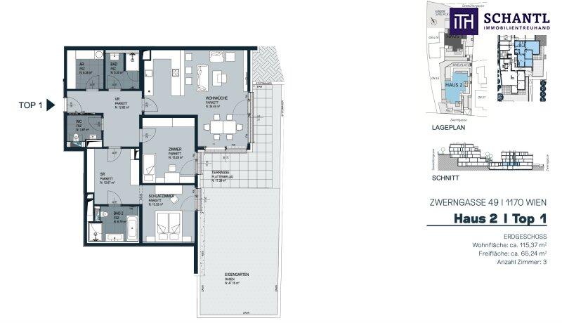 In Dornbach, einem der grünsten und charmantesten Grätzel Wiens, treffen Naturverbundenheit und Urbanität aufeinander. Die Zwerngasse liegt idyllisch eingebettet zwischen Schafberg und Weinbergen: Spaziergänge oder Joggingrunden im Schlosspark Pötzleinsdorf und ein Sprung ins nahegelegene Schafbergbad machen diesen Wohnort besonders lebenswert. In dieser traumhaften Gegend erwartet Sie eine hochwertig ausgestattete Gartenwohnung mit ca. 115,37 m² Wohnfläche, drei großzügigen Zimmern, zwei separaten WCs, zwei Badezimmern und großzügigen Freiflächen von ca. 65,24 m², bestehend aus einer sonnigen Terrasse und einem Eigengarten.