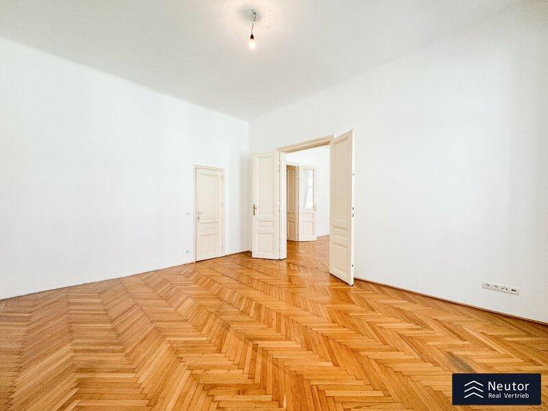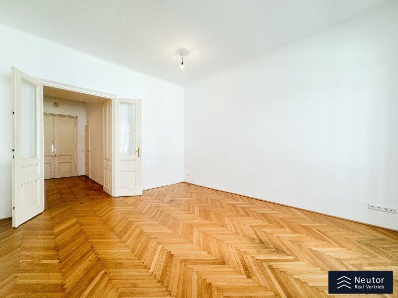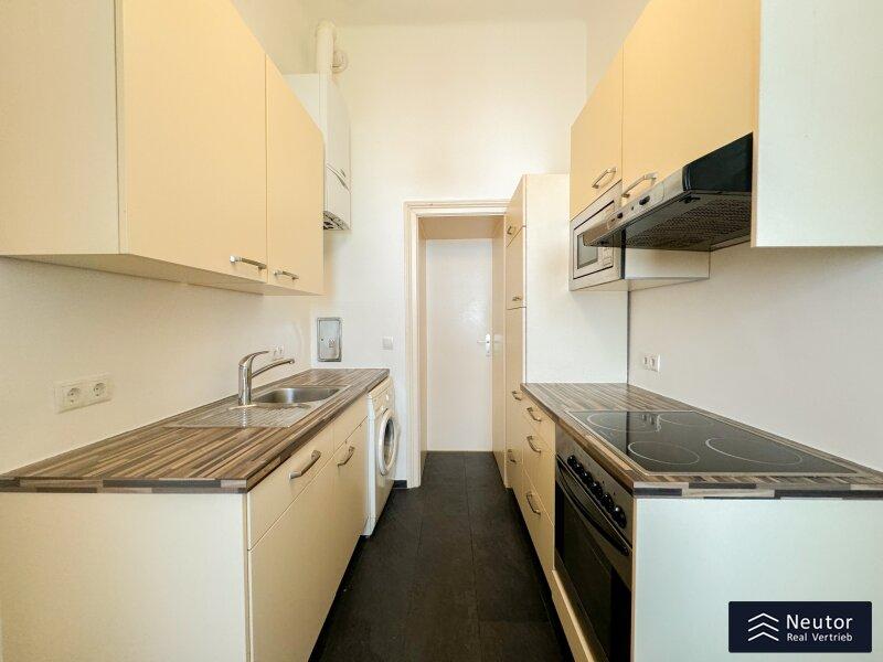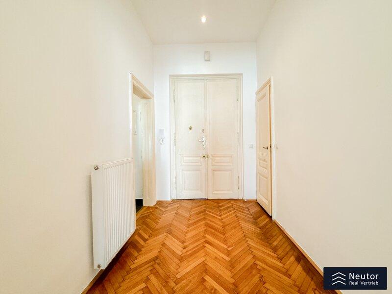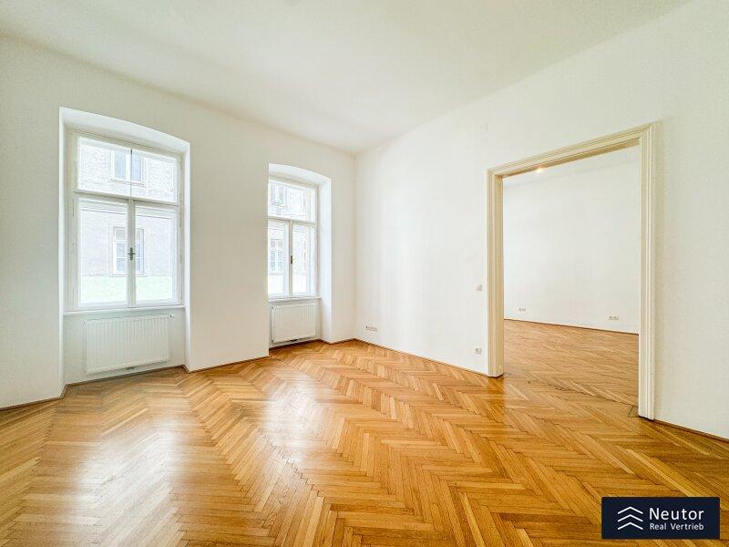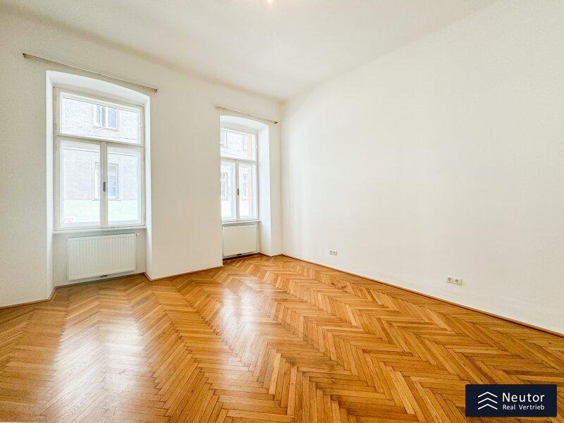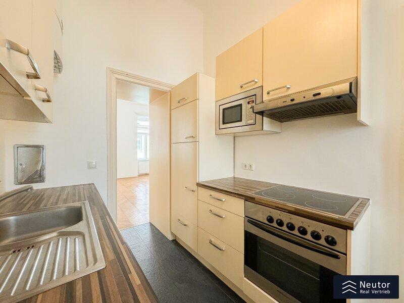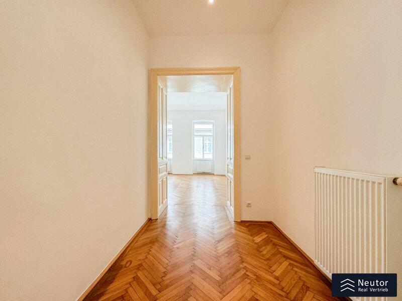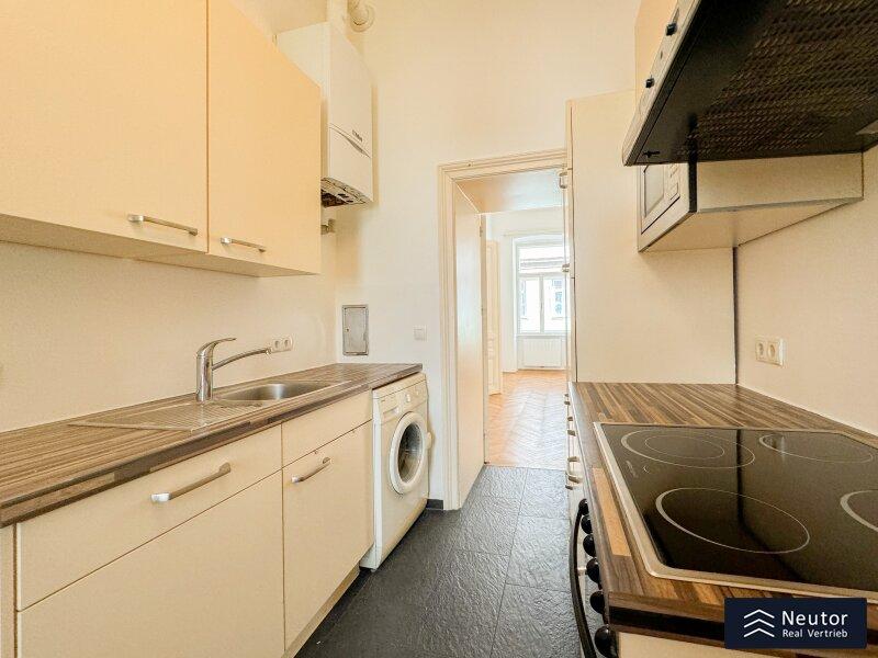 Im Herzen von Mariahilf, nur wenige Schritte von der Mariahilfer Straße und dem Haus des Meeres entfernt, präsentiert sich dieses stilvolle Altbaujuwel als perfekte Symbiose aus klassischer Wiener Wohnkultur und zeitgemäßem Wohnkomfort. Bereits beim Eintreten empfängt Sie ein äußerst großzügig gestalteter Vorraum, der mit seiner Weitläufigkeit und den exzellenten Stauraummöglichkeiten den eleganten Charakter der Wohnung unterstreicht. Hier beginnt das Gefühl von Großzügigkeit, das sich durch die gesamte Immobilie zieht. Zur Linken des Eingangsbereichs befindet sich das separat gelegene WC, welches mit einem eigenen Handwaschbecken ausgestattet ist ein diskretes Detail, das Komfort und Funktionalität ideal verbindet. Rechter Hand gelangt man in die separate Küche, die nicht nur durch ihre vollständige Ausstattung überzeugt, sondern auch durch ein Fenster mit Blick in das ruhige Stiegenhaus. Der Küchenbereich bietet ausreichend Platz zum Kochen und Verweilen und ist der ideale Ort für Genuss und Gastlichkeit. Direkt an die Küche anschließend eröffnet sich das stilvolle Badezimmer, das mit einer hochwertigen Dusche, einem eleganten Waschtisch sowie einem weiteren Fenster ins Stiegenhaus ausgestattet ist. Dadurch wird nicht nur für optimale Belüftung gesorgt, sondern auch für angenehmes, natürliches Tageslicht ein echtes Highlight unter den Altbau-Badezimmern. Das Herzstück der Wohnung bildet zweifellos das großzügige Wohnzimmer. Lichtdurchflutet durch klassische Kastenstockfenster und verbunden durch originale Flügeltüren, vermittelt dieser Raum ein Gefühl von Weite und Behaglichkeit. Die hohen Decken und der gepflegte Parkettboden verstärken den typischen Altbau-Charme, der in dieser Wohnung stilvoll in Szene gesetzt wird. Das Schlafzimmer, das sowohl über das Wohnzimmer als auch direkt von der Küche aus zugänglich ist, schafft einen angenehmen Rückzugsort mit wohnlicher Atmosphäre. Auch hier setzt sich der hochwertige Parkettboden fort und unterstreicht den stimmigen Gesamteindruck der Immobilie.