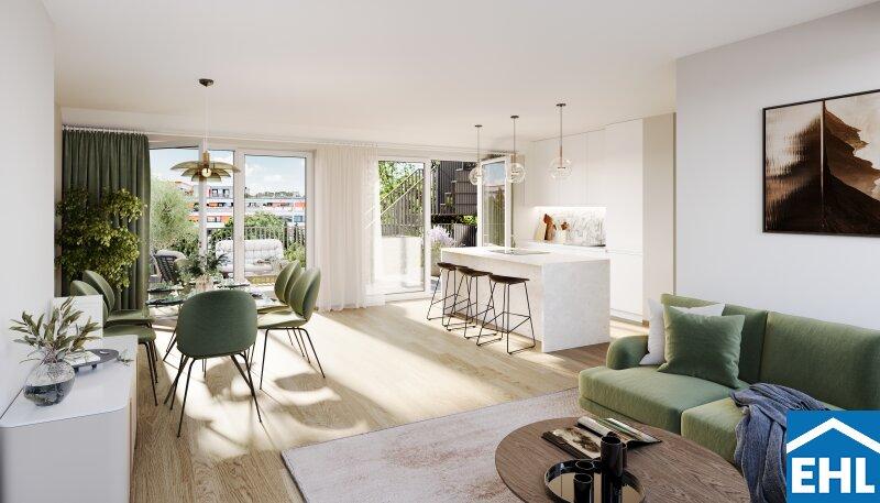 Großzügige private Freiflächen wie Eigengärten, Balkone, Terrassen, Loggien sowie beeindruckende Dachterrassen mit Panoramablick schaffen ein einzigartiges Wohngefühl.