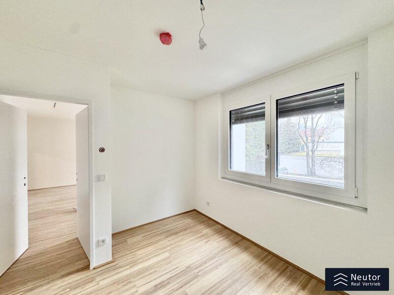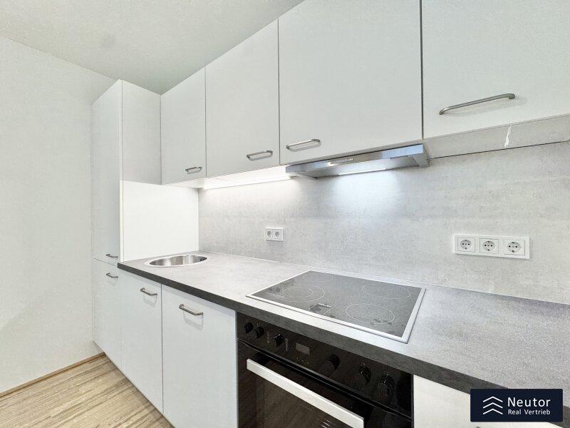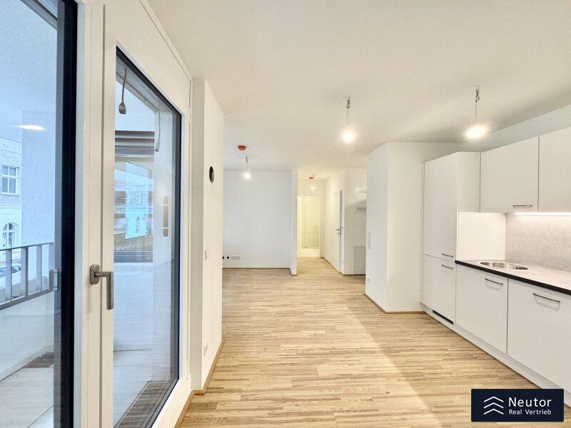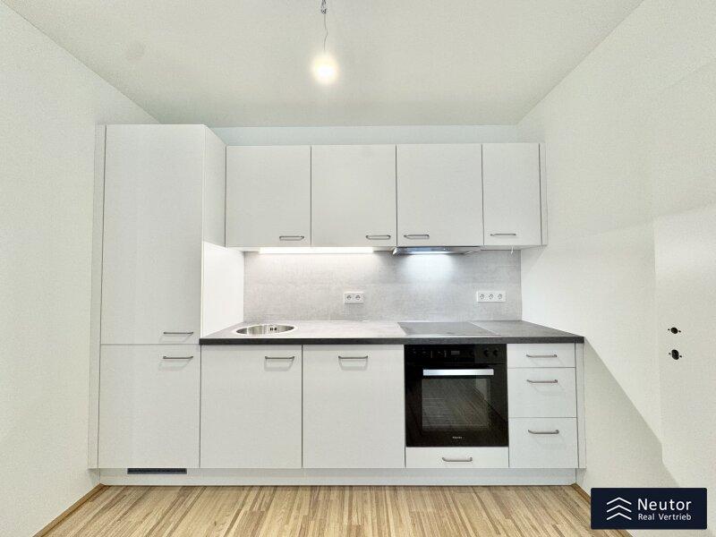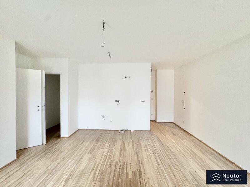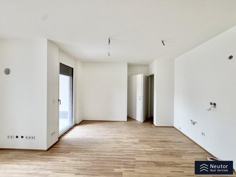 Diese stilvolle Wohnung überzeugt durch eine durchdachte Raumaufteilung, hochwertige Materialien und ein modernes Wohnambiente. Beim Betreten empfängt Sie ein einladender Vorraum, der ausreichend Platz für Garderobe und Stauraum bietet. Rechtsbefindet sich ein separates WC mit Handwaschbecken praktisch für Gäste und den Alltag. Geradeaus öffnet sich der lichtdurchflutete Wohnbereich, der Küche, Essplatz und Wohnzimmer harmonisch vereint. Hier entsteht ein offener, freundlicher Raum, der sowohl zum Entspannen als auch zum geselligen Beisammensein einlädt. Vom Wohnzimmer aus gelangen Sie direkt auf die überdachte Loggia ein geschützter Freiraum, der zum Verweilen im Freien einlädt, ganz gleich bei welchem Wetter. Das Schlafzimmer, das ebenfalls direkt vom Wohnzimmer aus begehbar ist, bietet nicht nur angenehme Ruhe, sondern verfügt auch über ein eigenes, modernes En-Suite-Badezimmer mit Dusche ideal für zusätzlichen Komfort und Privatsphäre. Mit ihrer klaren Raumaufteilung, den hochwertigen Ausstattungsdetails und der hellen Wohnatmosphäre ist diese Wohnung ein Zuhause, das durch Stil und Funktionalität gleichermaßen überzeugt. Ein Wohntraum für Singles, Paare oder alle, die modernes Wohnen mit cleverem Grundriss schätzen!