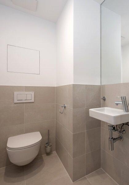 Modern verflieste Nassräume mit Markenarmaturen