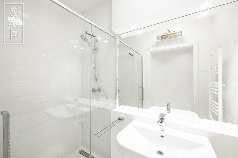 - Das Badezimmer: Modern und kompakt gestaltet mit einer bodenebenen, begehbaren Dusche, einem großen Spiegel sowie einem Handtuchheizkörper.