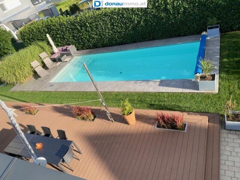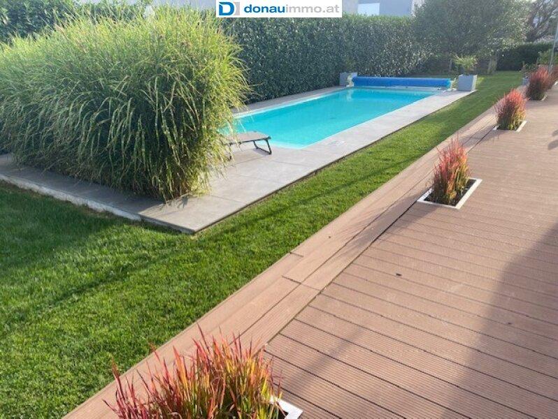 Ein weiteres Highlight ist der elegante Außenpool mit hochwertiger Plattierung, der in der behaglich gestalteten Gartenanlage eine wahre Wohlfühloase bildet.