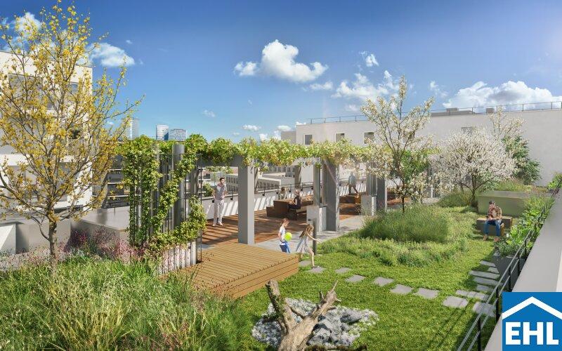 Einladende Sitzbereiche, Pergola-Überdachungen und ein wunderschöner Blick in den Park laden zum Verweilen ein. PARK FLATS vereint urbanes Wohnen und Natur auf ideale Weise ein Ort, um das Leben in all seinen Facetten zu genießen.
