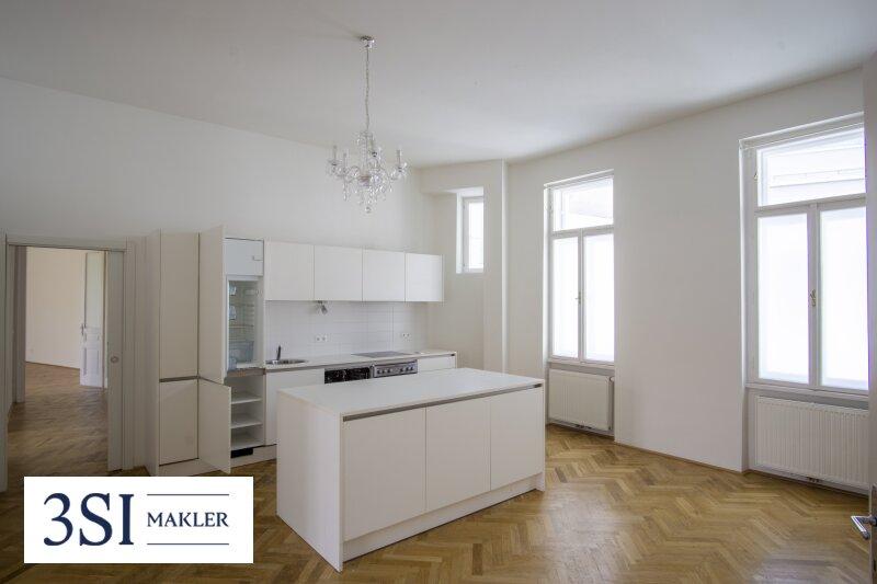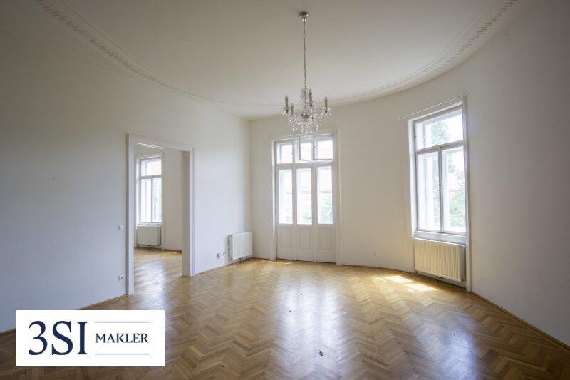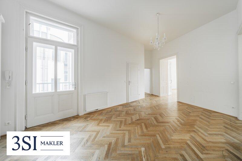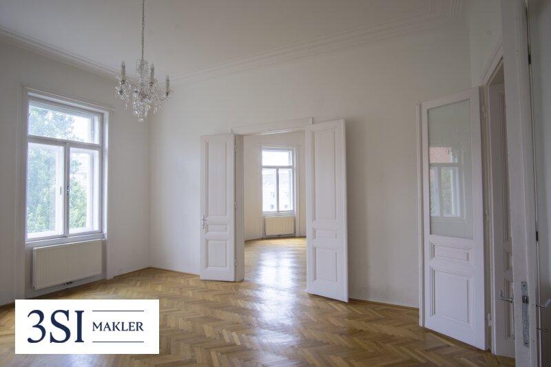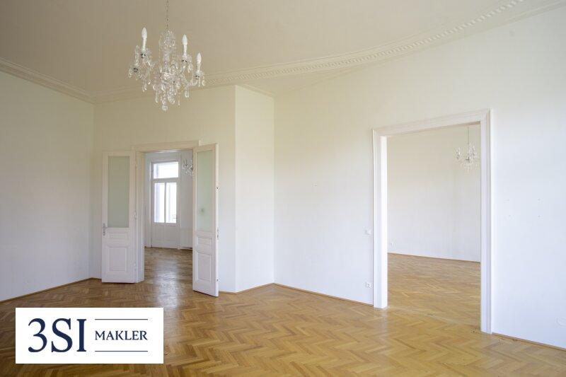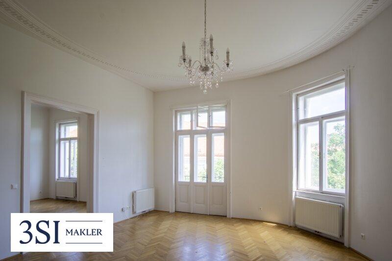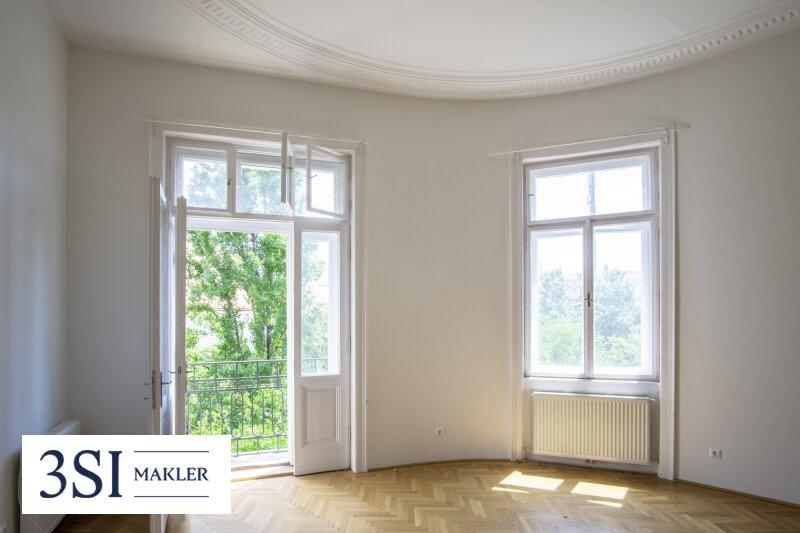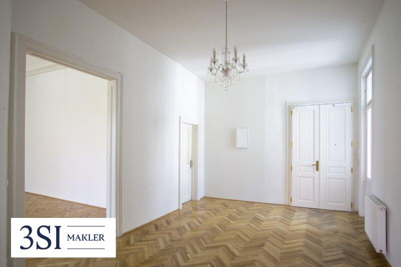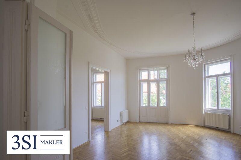 • Französisches Fischgrätparkett, prachtvolle Stuckleisten, traditionelle Kastenfenster mit Laibungen, hohe Türen im Alt-Wien Stil