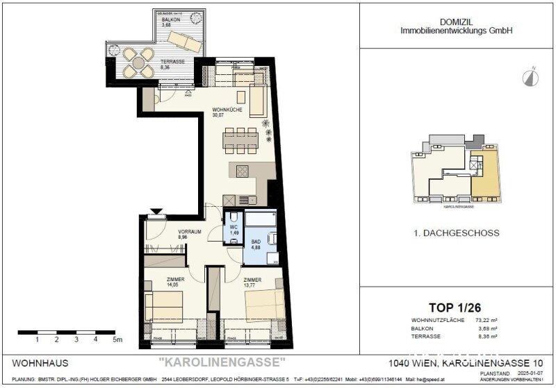 Die gegenständliche Wohnung befindet sich im ersten DG und verfügt über eine Wohnfläche von ca. 73 m² plus Balkon und Terrasse.