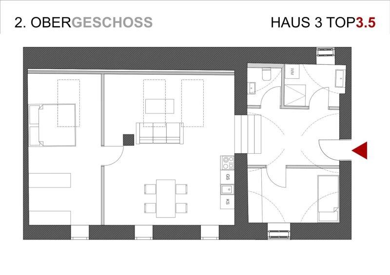 Treten Sie ein und entdecken Sie diese lichtdurchflutete 82,84m² Wohnung. Vom großzügigen und geräumigen Eingangsbereich gelangen Sie in das Essbereich, welches mit einer vollwertigen Einbauküche ausgestattet ist. Vom Essbereich aus, kommen Sie in das jeweilige Schlafzimmer. Vom Gang gelangen Sie ebenso zum Badezimmer, samt Dusche mit Waschbecken und zum separatem WC.