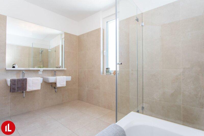 - elegant verfliestes Badezimmer mit Badewanne, Dusche, 2x Waschbecken und Fenster