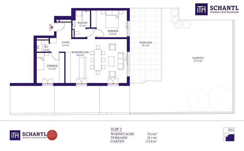 Wohnfläche: ca. 74,2 m² + Terrasse: ca. 33,1 m² + Garten: ca. 113,4 m² + Kellerabteil