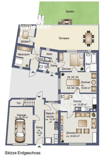 Das Haus ist in einem gepflegten Zustand und wurde stets liebevoll gepflegt. Beim Betreten des Gebäudes gelangen Sie direkt zum zentralen Stiegenhaus, der Garage, dem umschlossenen Innenhof, dem Heizraum, dem Erdkeller, dem Gartenstüberl, der Terrasse, dem großzügigen Garten und der Erdgeschosswohneinheit. Alle drei Wohneinheiten sind lichtdurchflutet und sehr geräumig.