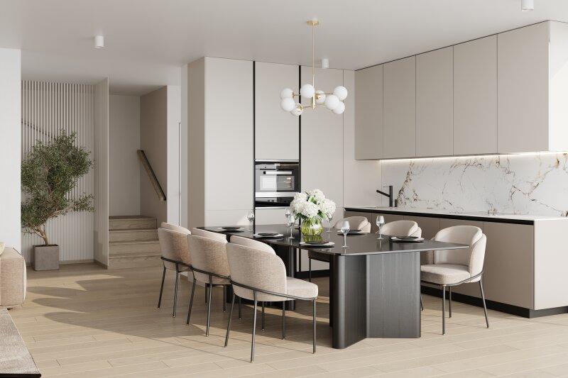 Jedes Haus ist lichtdurchflutet gestaltet und bietet eine großzügige Raumaufteilung auf drei Ebenen. Private Gärten, Terrassen und Dachterrassen schaffen eine ideale Balance zwischen Wohnkomfort und naturnahem Lebensstil. PKW-Stellplätze mit E-Ladesäulen sorgen für zusätzlichen Komfort und Nachhaltigkeit.