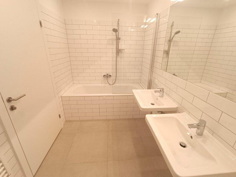 Im Vorraum der Wohnung befindet sich ein praktischer Abstellraum mit Waschmaschinen-Anschluss, sowie die separate Toilette mit Handwaschbecken und ein großzügiges Badezimmer mit 2 Handwaschbecken und einer Badewanne mit Glas-Duschtrennwand, sowie Handtuchheizkörper. Auf einer Fläche von rund 7,57 m² findet auch Ihre Garderobe problemlos Ihren Platz.