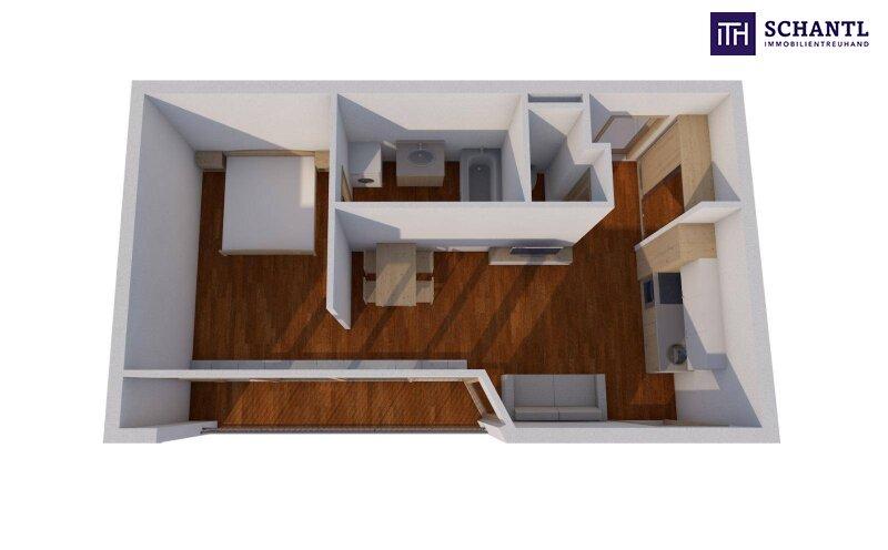 Auf 46,14 m² Wohnfläche präsentiert sich die Wohnung durchdacht, effizient und ohne verlorene Quadratmeter. Der Wohn-/Essbereich ist offen gehalten und bietet genügend Platz für Wohnen, Arbeiten und Entspannen. Die neue, moderne Küche fügt sich harmonisch in den Raum ein funktional, klar und hochwertig ausgeführt.