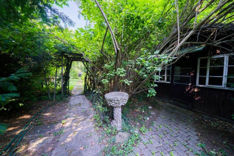 Hinter dem Wohnhaus, inmitten des weitläufigen Gartens, überrascht ein verwunschenes Platzerl: Ein kleines Holzhäuschen, eine Laterne, eine kleine Bank umgeben von üppigem Grün lädt es zum Verweilen, Entspannen und Träumen ein.
