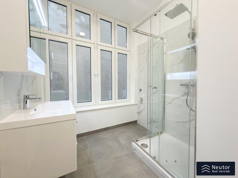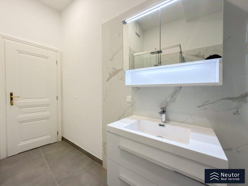 Gelegen im ersten Obergeschoß eines gepflegten klassischen Altbaus, überzeugt diese 3-Zimmer-Wohnung insbesondere durch ihre ruhige Innenhofausrichtung. Bereits beim Eintreten empfängt Sie ein großzügig gestalteter Vorraum, der einen repräsentativen ersten Eindruck vermittelt und ausreichend Platz für eine elegante Garderobenlösung bietet. Rechterhand befindet sich das separat angelegte WC mit einem Handwaschbecken. Das hochwertig ausgestattete Badezimmer besticht durch edle Fliesen, eine moderne Regendusche, sowie sorgfältig ausgewählte Armaturen in zeitloser Eleganz.