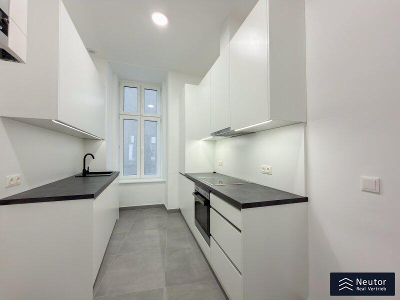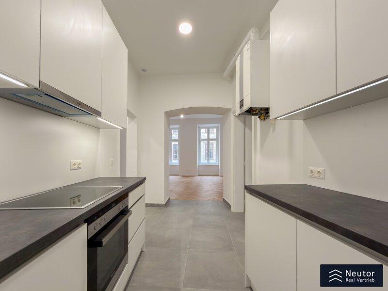 Das großzügige Wohnzimmer bildet das Herzstück der Wohnung. Klassische Doppelkasten-Flügeltüren verleihen dem Raum den unverwechselbaren Wiener Charme, großzügige Doppelkastenfenster durchfluten den Raum mit Tageslicht. Die Ausrichtung garantiert eine außergewöhnlich ruhige Wohnqualität - ein idealer Rückzugsort mit hoher Lebensqualität. Die Küche grenzt harmonisch an den Wohnbereich und vermittelt ein offenes, einladendes Wohngefühl, das Funktionalität und Wohnkomfort auf angenehme Weise verbindet.