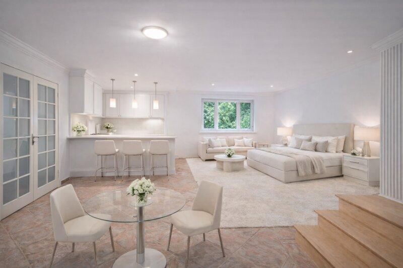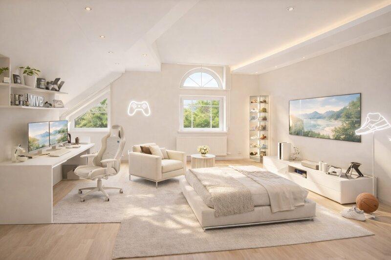 • Belletage Wohnen, Arbeiten oder Gäste: Gesamte Ebene mit Cathedral Ceiling, lichtdurchflutet und beeindruckender Raumwirkung. Sehr großer Wohnbereich, Master-Suite mit Bad & WC plus Küchenanschluss ideal als Homeoffice, Atelier, Mehrgenerationenwohnen oder exklusive Gästeetage. Top-moderne Zweitküche und drei zusätzliche Küchenanschlüsse für individuelle Gestaltung.