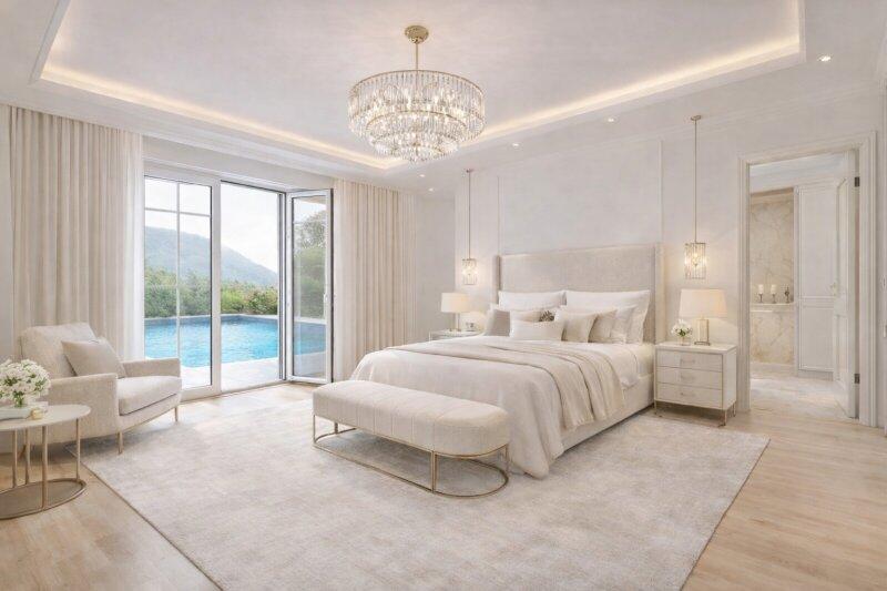 • Oberes Erdgeschoss Wohnen & Familie: Großzügiger Wohn- und Essbereich mit Panoramakamin (wärmt auch obere Etage), hochwertige Küche mit Zugang zu überdachten Terrassen, Master-Suite mit Wellness-Bad & WC, Ausgang zum Pooldeck, zwei weitere Schlafzimmer mit Bad & WC. Drei elegante Schlafzimmer insgesamt, eines mit En-Suite.
