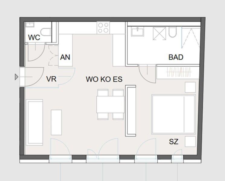 Vorzimmer, Wohn-Esszimmer mit offener Küche, Schlafzimmer, Badezimmer mit WC, separates WC und Kellerabteil