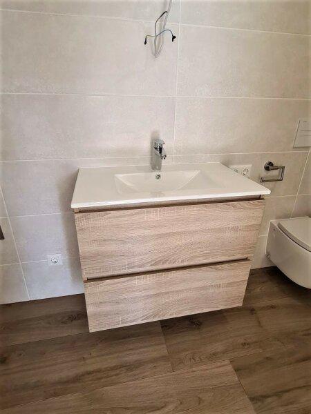 - Badezimmer mit Dusche, Waschtisch und Waschmaschinenanschluss