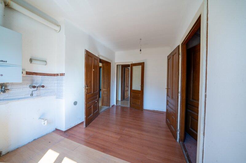 Ein gemeinsames Stiegenhaus führt in den ersten Stock: Hier stehen ein großer Salon, zwei Zimmer, eine Küche und ebenso eine Toilette mit Fenster zur Verfügung.