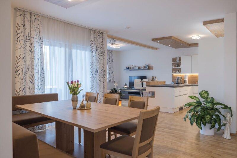 Angrenzend an Wohnzimmer und Essplatz erstreckt sich eine ca. 15 m² große Terrasse.
