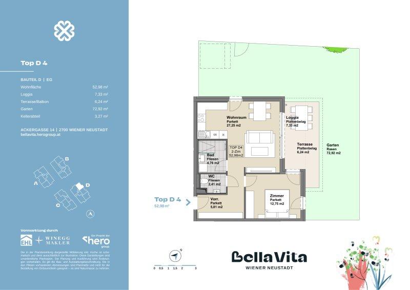 Das Wohnbauprojekt Bella Vita nahe des verzaubernden Wiener Neustädter Kanals steht für "schönes Leben" und das wird hier möglich. Im mediterranen Stil die Außen- und Allgemeinflächen: Gepflasterte Wege in Muschelkalk, Lauben und Schaukeln vermitteln Leichtigkeit, Gemütlichkeit und Wohlgefühl. Im Inneren überzeugende Raumaufteilung, stimmige Architektur, hochwertige Ausgestaltung. Und die Nachhaltigkeit stets im Blick, u.a. durch PV-Anlagen zur Energiegewinnung und einem Dachgeschoß in Holzhybridbauweise.