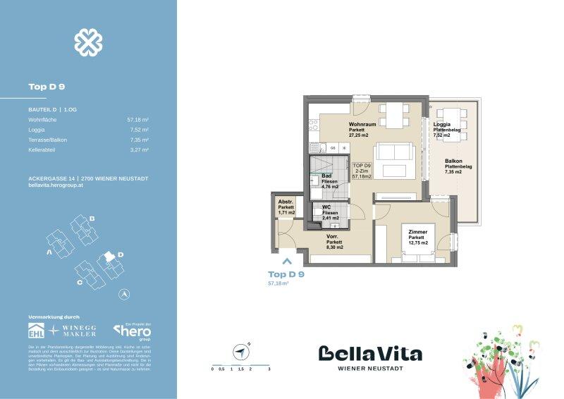 Fahrradabstellplätze, Kinderwagenraum, Spielplatz mit Pergola und Sitzmöglichkeiten sowie eine Tiefgarage vervollständigen das Angebot des durchdachten, modernen und nachhaltigen Projekts. Ein Tiefgaragenplatz ist zu erwerben (ab € 17.500,).