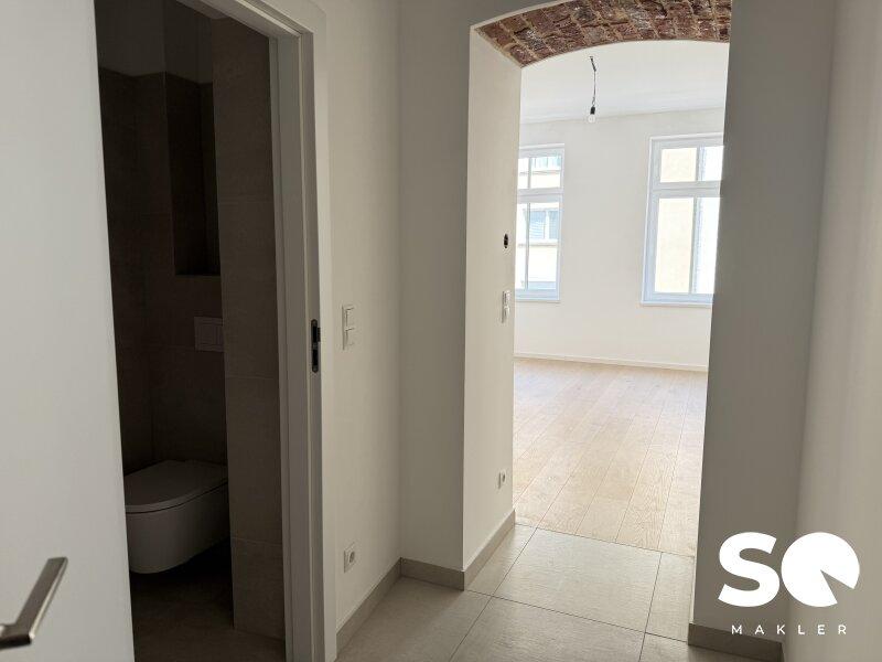 Das Badezimmer ist mit einer modernen Dusche, Waschmaschinenanschluss als auch Waschbecken ausgestattet. Ein separates WC befindet sich im Vorraum. Es erwarten Sie eine großzügige Wohnküche als auch ein eigenes Schlafzimmer. Dank neuer Fenster genießen Sie angenehme Lichtverhältnisse und ausgezeichnete Wärmedämmung, während Sie den Altbaucharakter in vollen Zügen erleben können.