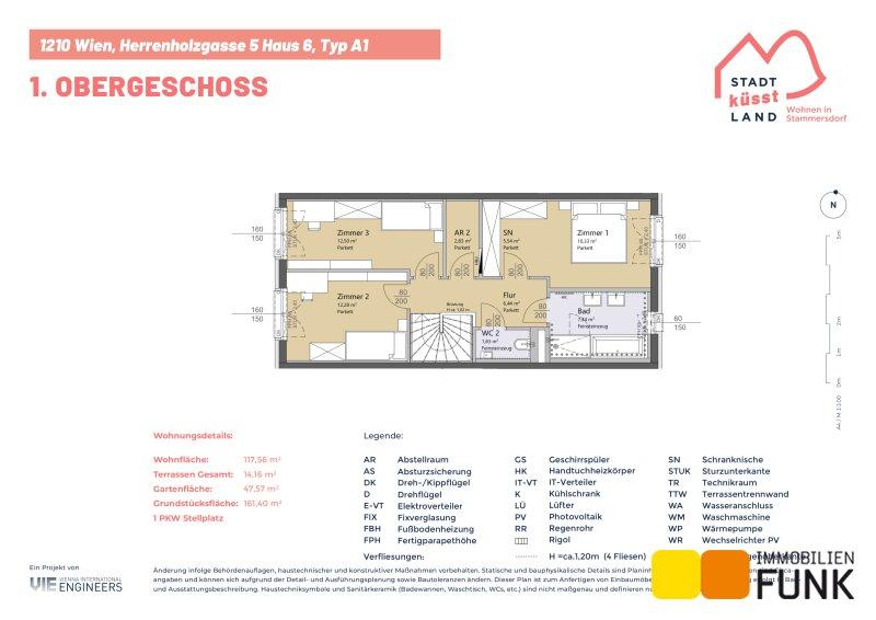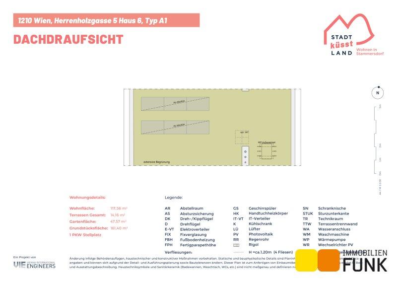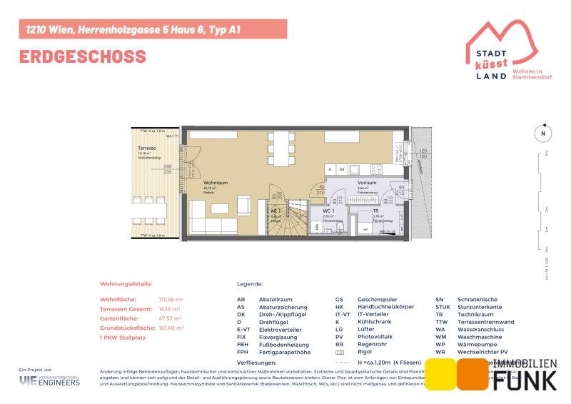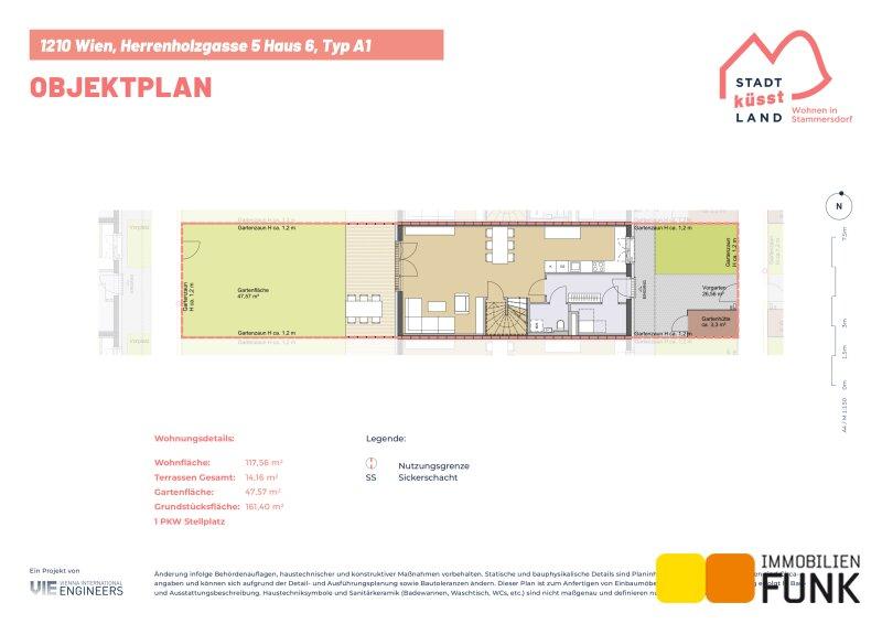 Das Reihenhaus 6 befindet sich in der Herrenholzgasse 5, 1210 Wien und wird auf einem ca. 161 m² großen Eigengrund errichtet. Seinen künftigen Bewohnern bietet es zudem eine komfortable Wohnfläche im Ausmaß von insgesamt ca. 117 m², angeordnet auf zwei Geschoßen mit 4 Zimmern, 2 Toiletten, einem großen Badezimmer, dem Technikraum und 2 Abstellräumen, sowie einer westseitig ausgerichteten Terrasse mit ca. 14 m², die sich zu einem großen Gartenbereich mit ca. 47 m² öffnet. Diesem Reihenhaus ist ein Parkplatz in unmittelbarer Nähe des Objekts zugewiesen. Der Kaufpreis für den KFZ-Platz beträgt 19.000,00 € .