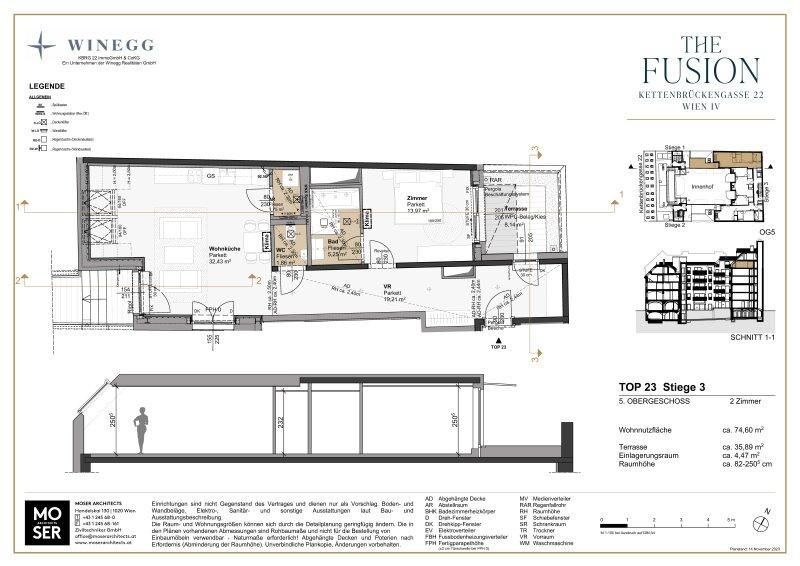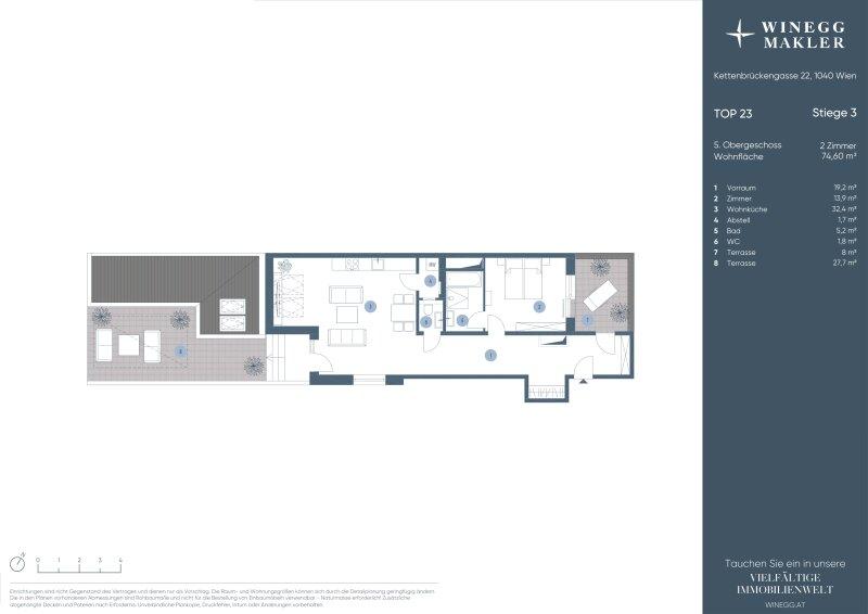 Der klimatisierte 2-Zimmer-Erstbezug befindet sich im 1. Dachgeschoß (entspricht dem 5. Obergeschoß) und verfügt über ca. 77 qm Wohnfläche sowie zwei Terrassen im Gesamtausmaß von ca. 40 qm.