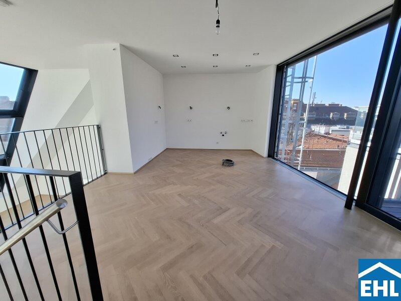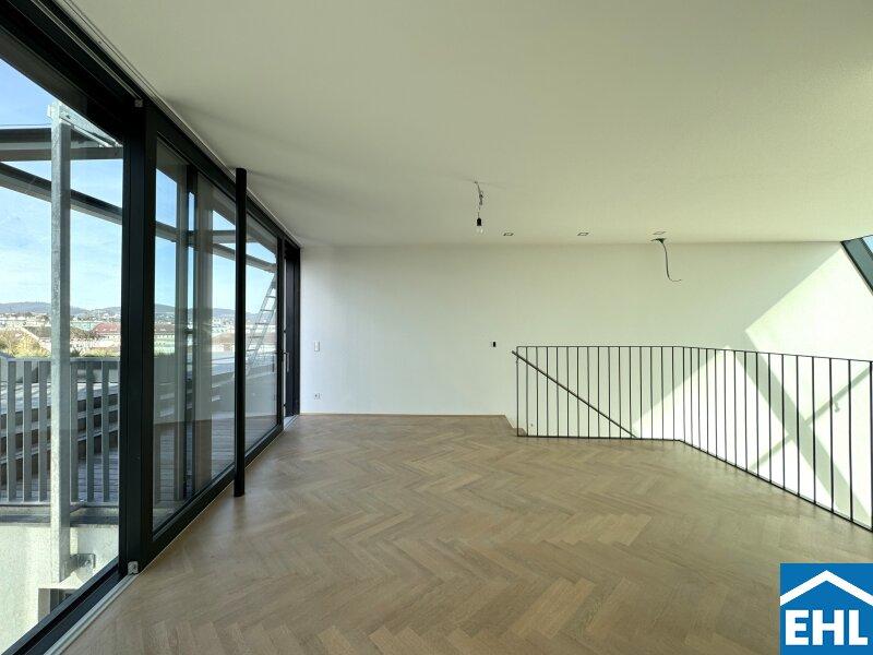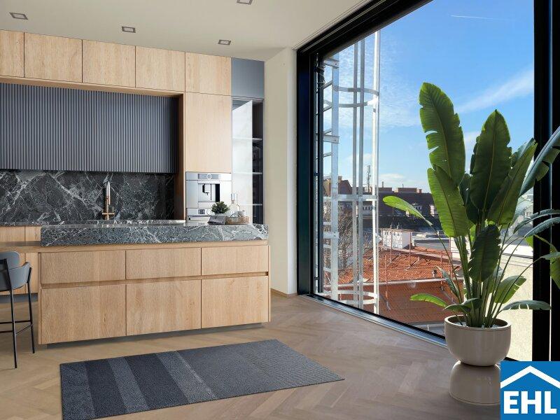 Über eine elegante Treppe erreichen Sie das Herzstück der Wohnung: die offen gestaltete Wohnküche. Lichtdurchflutet, weitläufig und stilvoll dieser Raum lädt zum gemeinsamen Kochen, Lachen und Genießen ein. Die großflächigen Hebe-Schiebetüren führen auf ein echtes Highlight: eine fast 50 m² große Terrasse mit spektakulärem Ausblick über Wien bis hin zum Kahlenberg. Ob Sonnenaufgang beim Frühstück oder Sundowner mit Freunden dieser Ort wird zum Lieblingsplatz über den Dächern der Stadt.