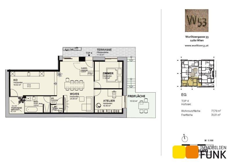 Über die ca. 11 m² große, gepflasterte Terrasse im ruhigen Innenhof betreten Sie die Wohnung. Bereits beim Eintreten empfängt Sie ein geräumiger Garderobenbereich. Von hier gelangen Sie in den zentralen Wohn- und Essbereich mit ca. 24 m², der über zwei Stufen mit der ca. 18 m² großen Küche verbunden ist. Vom Wohnbereich aus sind die beiden weiteren Zimmer der Wohnung mit ca. 11 m² und ca. 10 m² erreichbar. Auf der gegenüberliegenden Seite befinden sich das rund 6 m² große Badezimmer, ausgestattet mit Badewanne, Dusche, Waschtisch, Handtuchtrockner und Waschmaschinenanschluss, sowie ein separates WC. Eine weitere Terrasse mit ca. 4 m² und direktem Zugang von der Küche sorgt für zusätzliches Tageslicht in Küche und Bad. Ergänzend gelangen Sie von der Innenhofterrasse über wenige Stufen zu einer weiteren Freifläche mit ca. 15 m² ideal zum Entspannen im Freien.